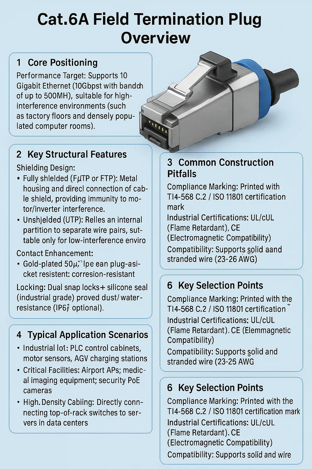 | Tính năng | Cắm kết thúc trường Cat.6A | Cắm Crimp Cat.6 tiêu chuẩn | Tác động thực tế |